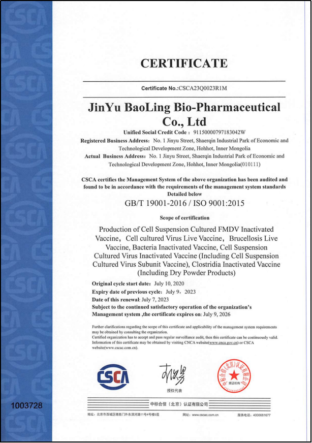 自2002年我公司作為行業(yè)內(nèi)第一家通過農(nóng)業(yè)部GMP認證以來,歷經(jīng)數(shù)次GMP監(jiān)督檢查、靜動態(tài)驗收、復驗,至今我公司已有9條GMP生產(chǎn)線取得獸藥GMP證書,生產(chǎn)范圍覆蓋布氏菌病活疫苗、細菌滅活疫苗(2條生產(chǎn)線)、細胞懸浮培養(yǎng)病毒滅活疫苗(含細胞懸浮培養(yǎng)病毒亞單位疫苗和細胞懸浮培養(yǎng)亞單位疫苗)(2條生產(chǎn)線)、梭菌滅活疫苗(含干粉制品)、細胞培養(yǎng)病毒活疫苗、細菌活疫苗、細胞懸浮培養(yǎng)口蹄疫病毒滅活疫苗。于2024年2月通過了mRNA疫苗生產(chǎn)線靜態(tài)驗收,是全國首家獸用核酸疫苗生產(chǎn)線,豐富了生產(chǎn)線,實現(xiàn)了獸用疫苗的迭代升級。