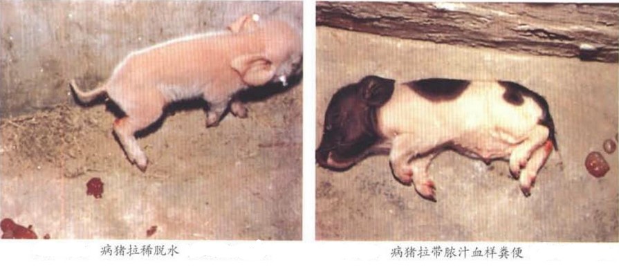 急性型:患豬體溫升高不明顯或略微升高,達(dá)40.0-40.5℃。病程2d左右,常維持2-3d后死亡。病豬開始出現(xiàn)急劇腹瀉,排出含有灰色壞死組織碎片的紅褐色液體糞便;疾∽胸i皮膚干燥無彈性、重度脫水,表現(xiàn)不吃奶,兩后肢與肛門周圍沾污暗紅色血樣糞便,不愿運(yùn)動(dòng),日益消瘦,衰弱無力,最后衰竭死亡。