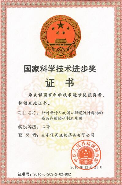 年度國家科學(xué)技術(shù)獎勵大會。金宇保靈生物藥品有限公司參與申報的《針對新傳入我國口蹄疫流行毒株的高效疫苗的研制及應(yīng)用》榮獲2016年度國家科學(xué)技術(shù)進步獎二等獎。此外,公司副董事長、首席獸醫(yī)師魏學(xué)峰及公司研發(fā)總監(jiān)劉國英作為上述項目主要完成人,均獲得此項目國家科學(xué)技術(shù)進步獎二等獎。