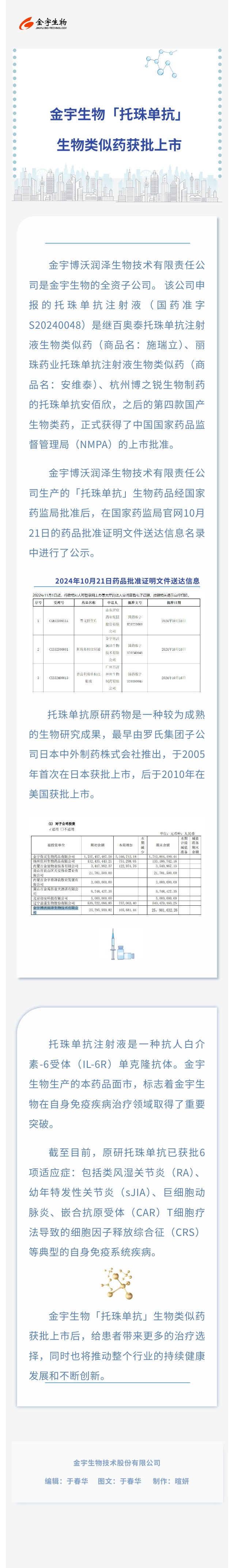 金宇生物「托珠單抗」生物類似藥獲批上市