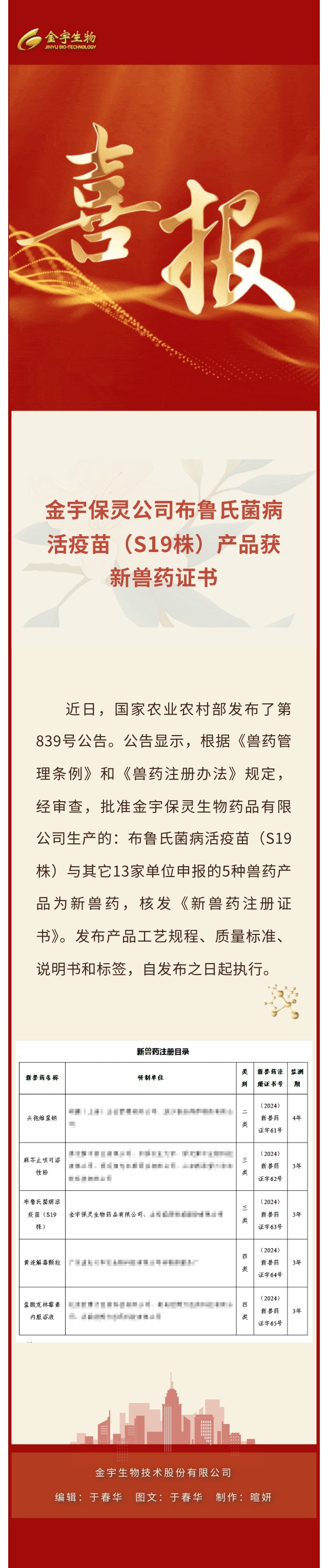 金宇保靈公司布魯氏菌病活疫苗(S19株)產(chǎn)品獲新獸藥證書(shū)