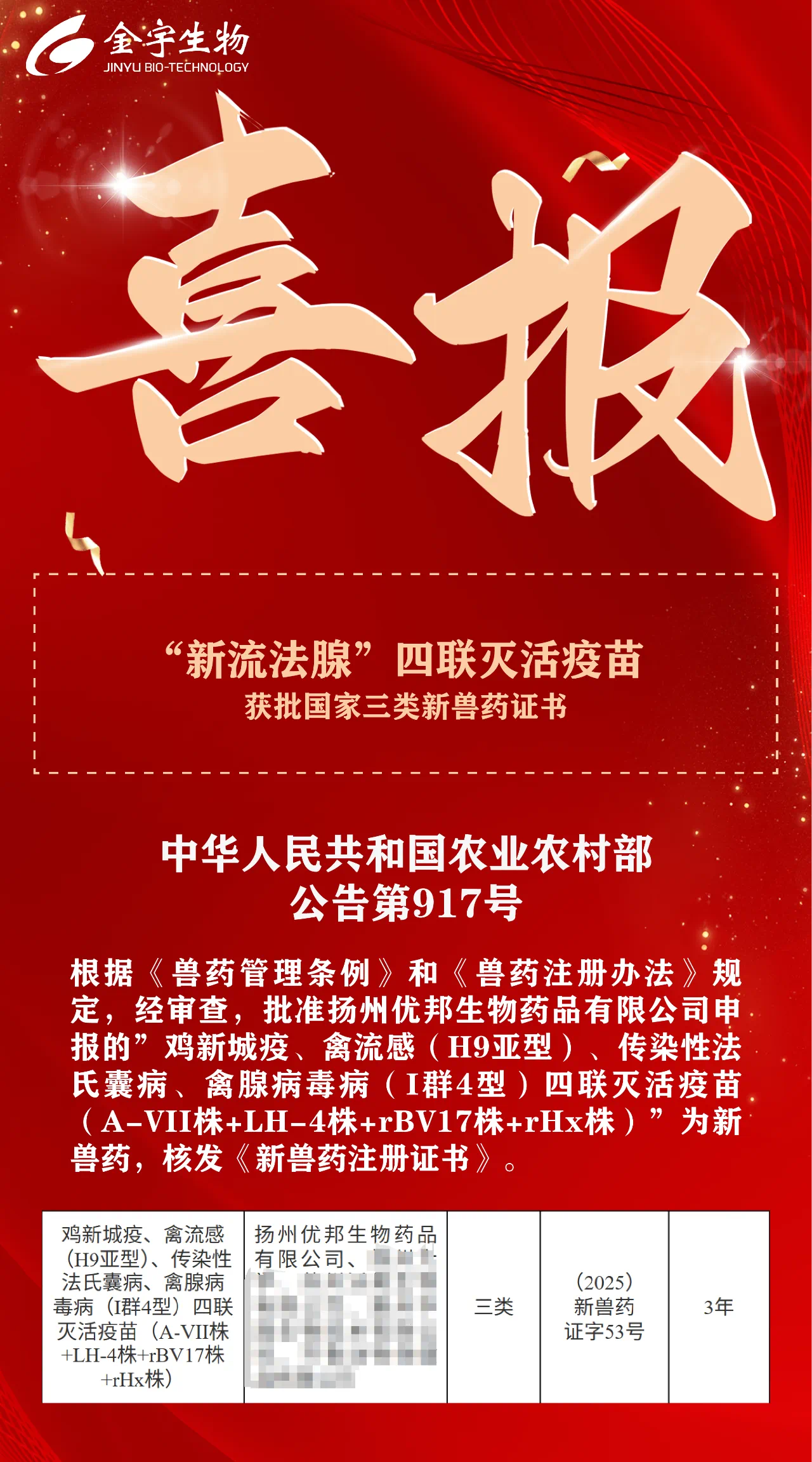 喜報 | 金宇優(yōu)邦“新流法腺”四聯(lián)滅活疫苗獲國家三類新獸藥證書