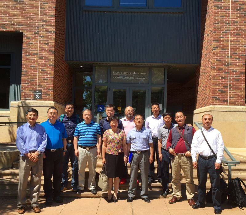 在明尼蘇達州的首府明尼阿波利斯,我們一行14人參觀了明尼蘇達大學(xué)獸醫(yī)診斷中心,與明尼蘇達大學(xué)獸醫(yī)診斷中心主任James Collins、明尼蘇達大學(xué)教授、李曼養(yǎng)豬大會的項目主席Bob Morrison等5位教授進行座談,了解了美國豬流感、仔豬病毒性腹瀉、藍耳病的防控心得與體會。在獸醫(yī)大師面前我們還都是初出茅廬的小學(xué)生,做事風(fēng)格和思維方式還有許多不足之處,處理具體疫病略顯稚嫩。就像我在微信圈子里發(fā)出的感言:中國的獸醫(yī)們,面對一個個豬病問題,我們要加倍努力呦!